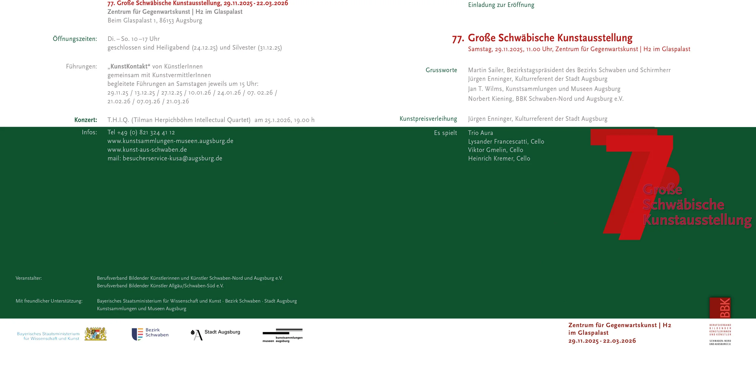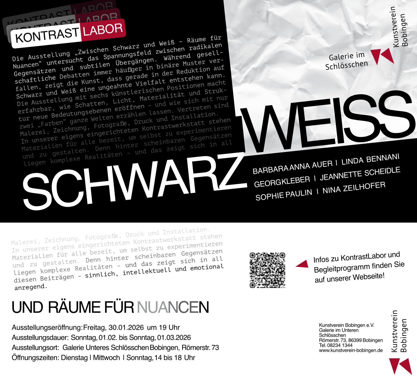 Mit Werken von BARBARA ANNA AUER, LINDA BENNANI, GEORG KLEBER, JEANNETTE SCHEIDLE, SOPHIE PAULIN, NINA ZEILHOFER Ausstellungseröffnung: Freitag, 30.01.2026 um 19 Uhr Ausstellungsdauer: Sonntag, 01.02. bis Sonntag, 01.03.2026 Ausstellungsort: Galerie Unteres Schlösschen Bobingen, Römerstr. 73 Öffnungszeiten: Dienstag | Mittwoch | Sonntag, 14 bis 18 Uhr