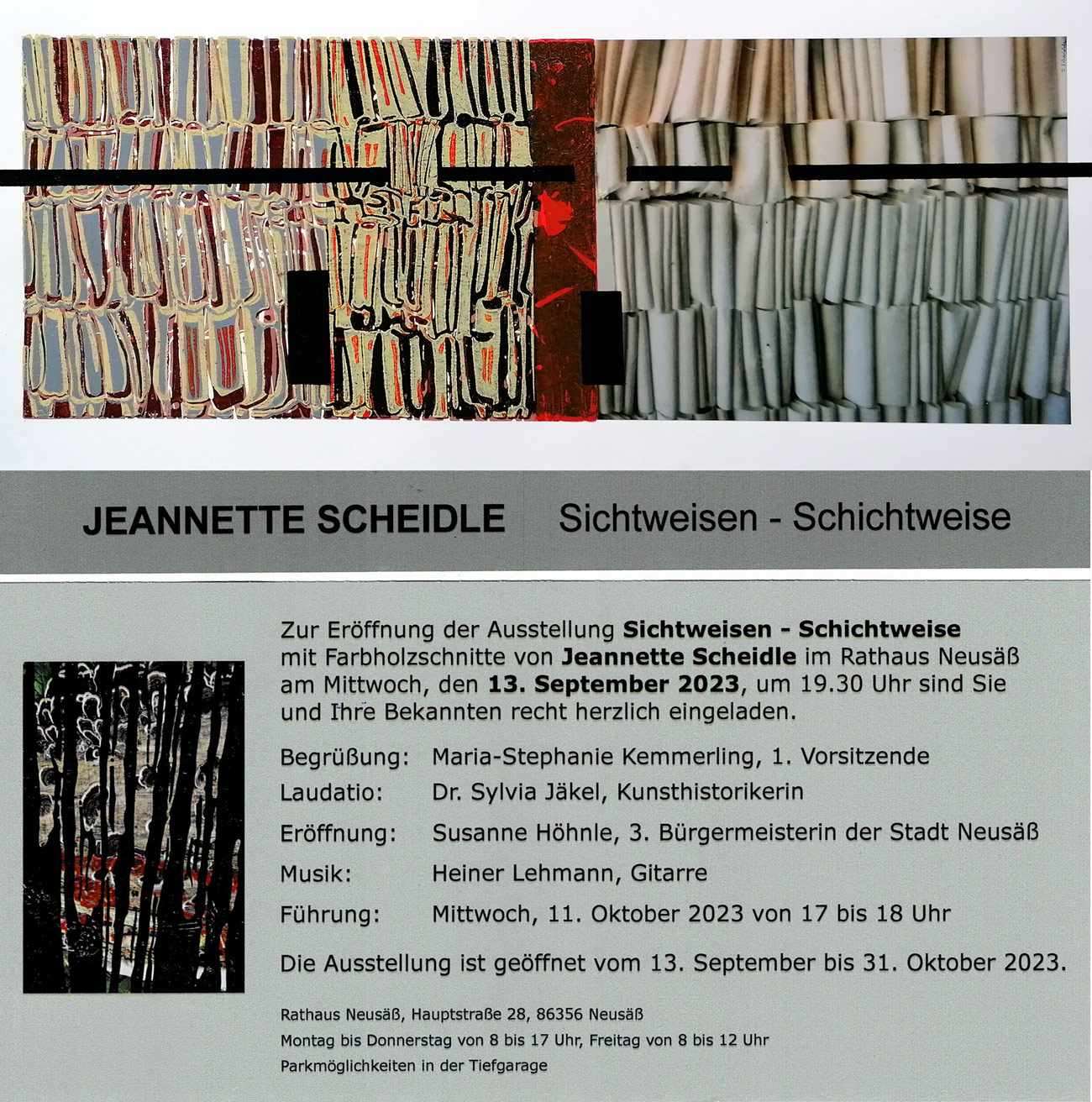 Die in Stadtbergen bei Augsburg lebende Künstlerin Jeannette Scheidle setzt sich in ihrem Werk seit jeher auf vielfältige Art und Welse mit unterschiedlichen Drucktechniken auseinander. In ihrer aktuellen Ausstellung Sichtweisen - Schichtweise in der Galerie im Rathaus Neusäß präsentiert sie eine Auswahl an Farbholzschnitten, die ihre künstlerische Perfektion in dieser Drucktechnick belegen. Durch eine Gegenüberstellung von Farbholzschnitt sowie Fotografie in einem Teil der ausgewählten Arbeiten, erhöht die Künstlerin die Aussagekraft, indem sie spielerisch beide Techniken kornbiniert. Dadurch entsteht ein vielschichtiger Dialog im Bild, der die verschiedenen Sichtweisen nach und nach schichtweise zum Ausdruck bringt.